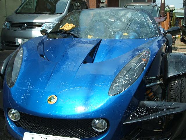 | ロータスエリーゼ系にはご法度のジャブジャブ洗車です。注意して水を掛けないと電気系が濡れてエンジンが 掛からなくなる事もあります。洗車シャンプーは台所用中性洗剤のJOYを使用。 |